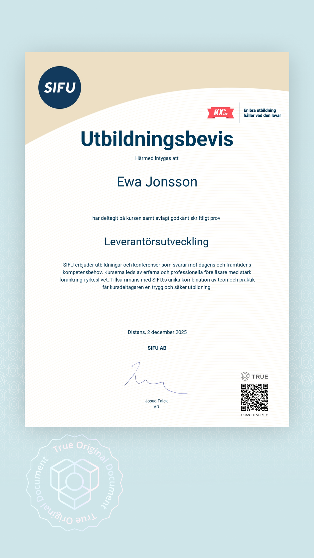 Alla TRUE -document är säkrade med blockchain-teknologi och kan verifieras som äkta. Klicka på verifieringsknappen bredvid dokumentet eller skanna QR-koden med din smartphones kamera. Ingen app krävs - dokumentets äkthet verifieras omedelbart.