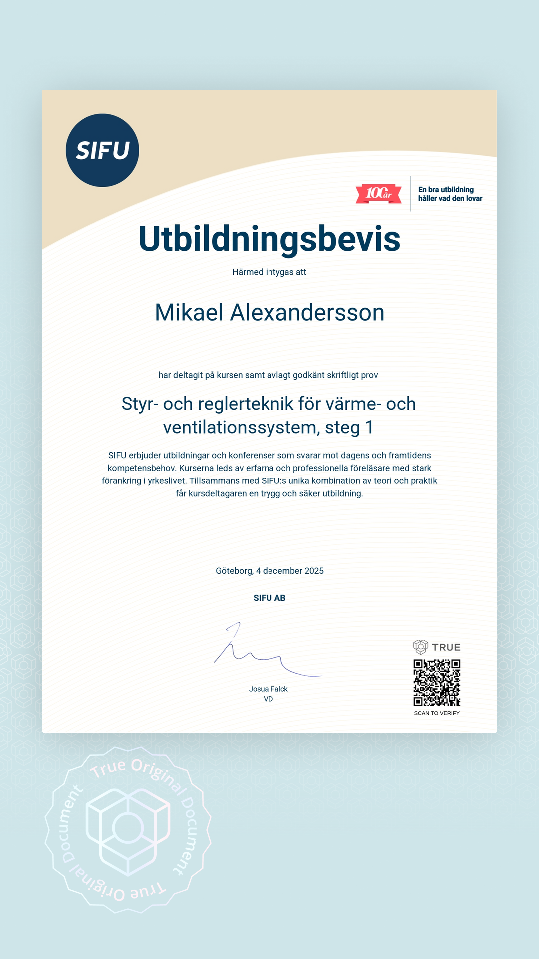 Detta utbildningsbevis visar att du genomfört och avslutat en utbildning hos SIFU AB.